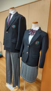 今期最初の受注は、品川特別支援学校です。紺のブレザーにチェックのスラックス、スカート、そしてネクタイのセット。このほかに、ワイシャツやベルトなどもご用意しています。